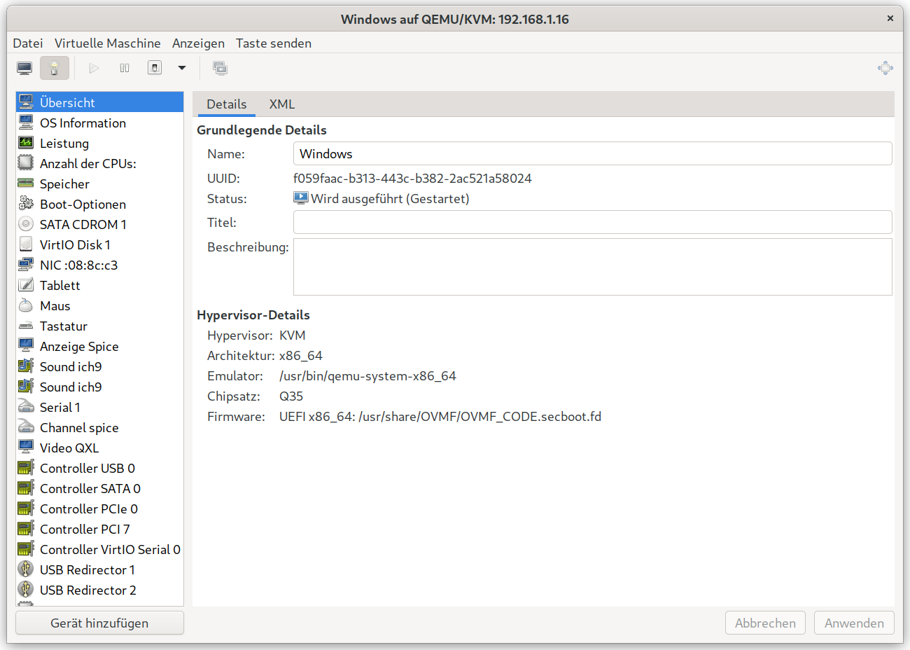 Am einfachsten geht die erstmalige Konfiguration mit dem virt-manager. Zunächst wird ein UEFI Boot (ms) benötigt.