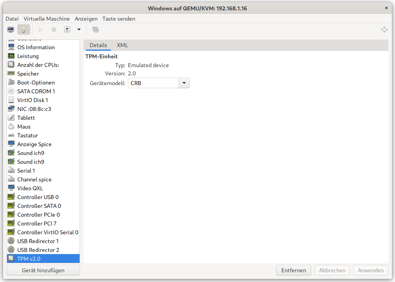 Bei Ubuntu 20.04LTS gibt es kein offizielles Paket für swtpm, daher ist selbst compilieren angesagt. Zunächst werden die Tools und Bibliotheken libtpms und swtpm benötigt. Bei Letzterem muss abweichend von der Anleitung die Source-Code Konfiguration mit ./autogen.sh --with-openssl --with-gnutls --prefix=/usr vorgenommen werden, ansonsten kann KVM nichts damit anfangen. Ansonsten einfach den Anleitungen dieser Tools folgen. Wenn swtpm_cert --version einen gefunden wird und einen sinnvollen Output liefert, dann sollte der Verwendung in KVM nichts mehr im Wege stehen.