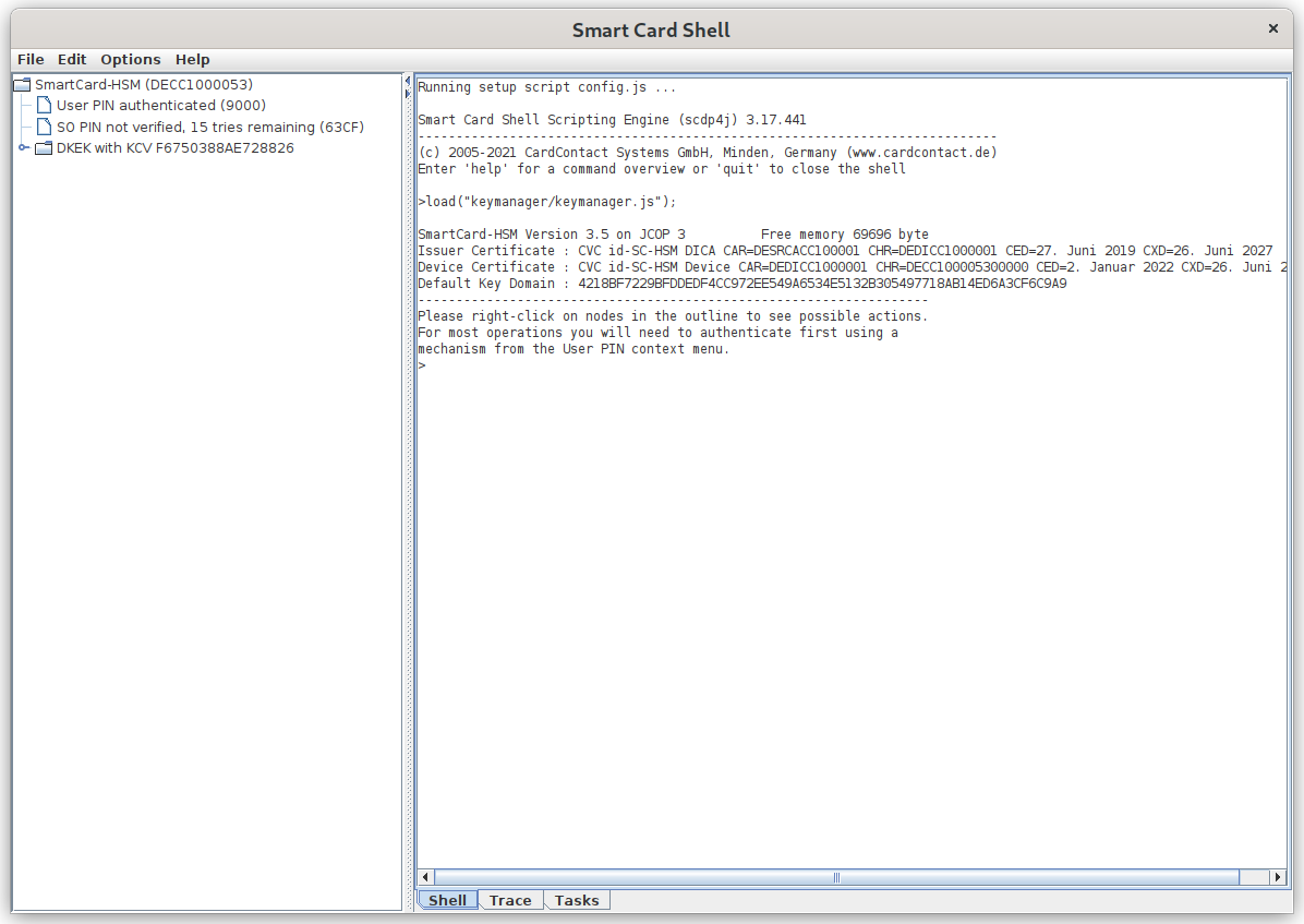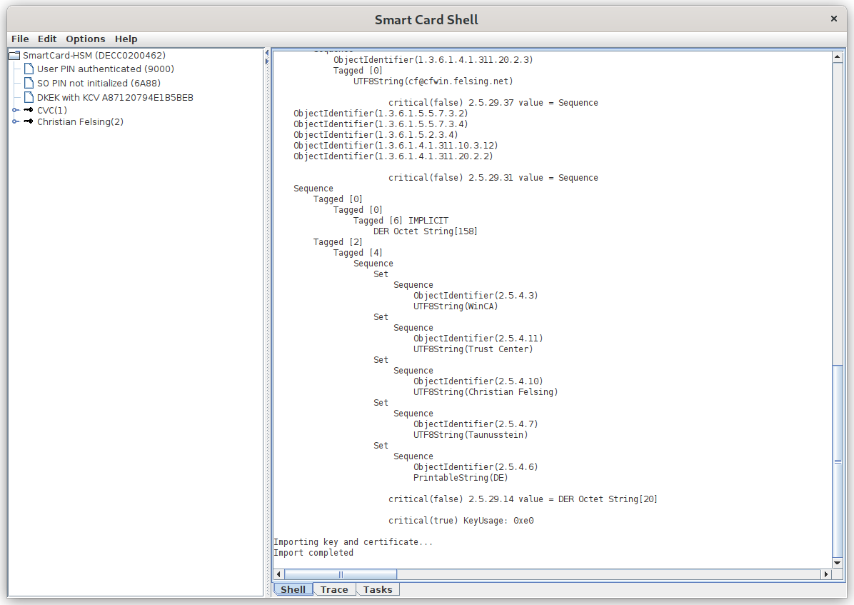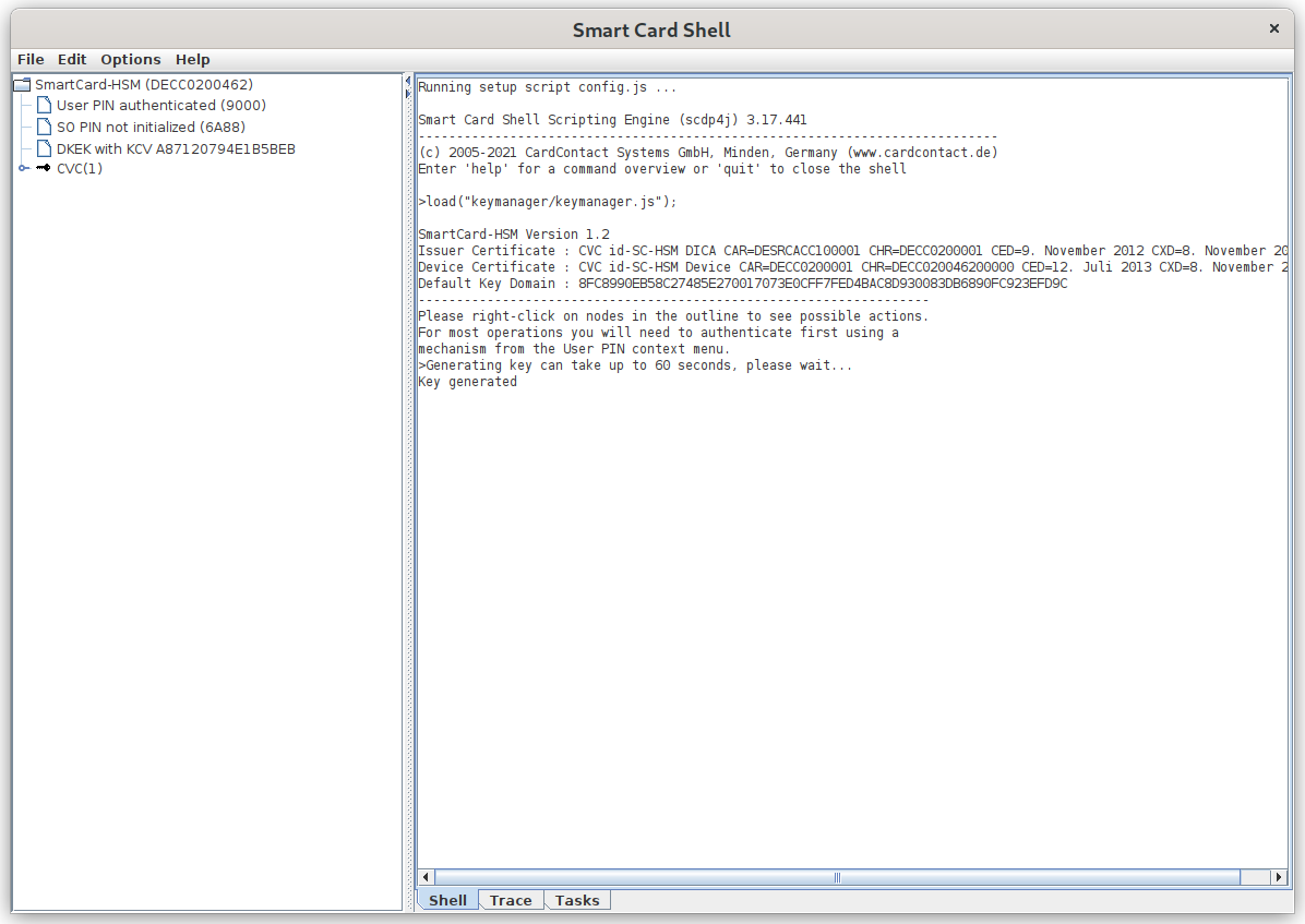 Das gehört jetzt zu den weniger schönen Seiten von Smartcard HSM. Zunächst wird die Smartcard Shell benötigt, die unter OpenSCDP zu bekommen ist (Open Source). Nach der Installation kann das Tool mit ./CardContact/scsh3/scsh3gui aufgerufen werden. Unter Files -> Keymanager wird das für den Import benötigte Script aufgerufen.